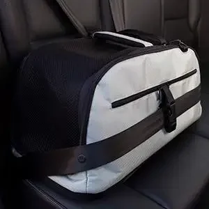 Sleepypod Air is a revolutionary carrier that redefines in-cabin pet travel. Air adapts to the various under-seat storage requirements set by different airlines while providing maximum comfort for your jet set pet. Worrying about buying a carrier that will not fit under a plane seat is a thing of the past. Our patent pending folding system allows pets to travel in the largest space possible while the airplane is in the air, yet still allows for stowage under an airline seat during takeoff and landing. When the captain says you can recline your seat, rotate the Sleepypod Air so it is between your feet and expand the ends so both you and your little friend can stretch out comfortably for the duration of the flight. In-cabin pet travel has never been so comfortable. Straps on both sides allow you to secure the Sleepypod Air in your car. A pass through pocket allows you to secure the Sleepypod Air to the telescoping handle on carry-on luggage.