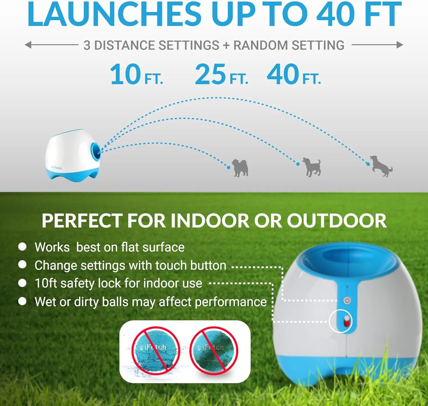 ADJUSTABLE LAUNCH DISTANCE: Our dog fetch machine can launch a standard sized tennis ball 10, 25, or 40 feet in the air, making it easy to use indoors (under 10 feet) or outdoors (all distances). Our automatic ball thrower even includes a random setting to randomize the distance. We recommend running a cloth through the machine periodically to maintain performance