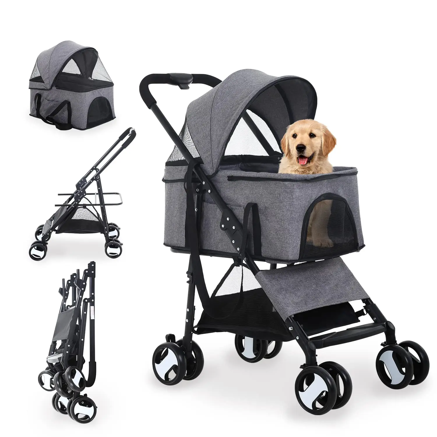 Foldable stroller for small and medium pets 3 in 1. With 4 wheels and detachable storage basket